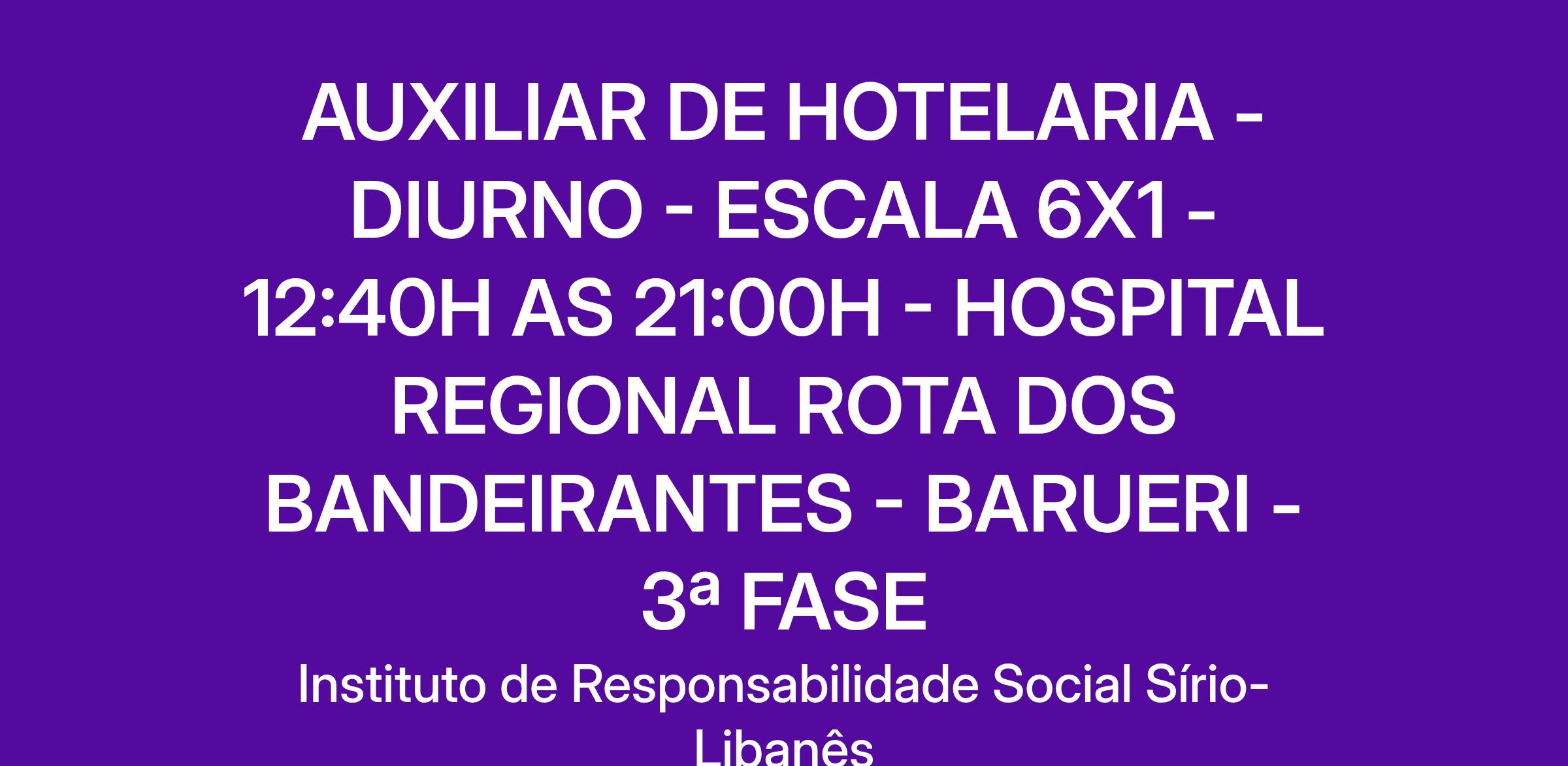 AUXILIAR DE HOTELARIA - DIURNO - ESCALA 6X1 - 12:40H AS 21:00H - HOSPITAL REGIONAL ROTA DOS BANDEIRANTES - BARUERI - 3ª FASE