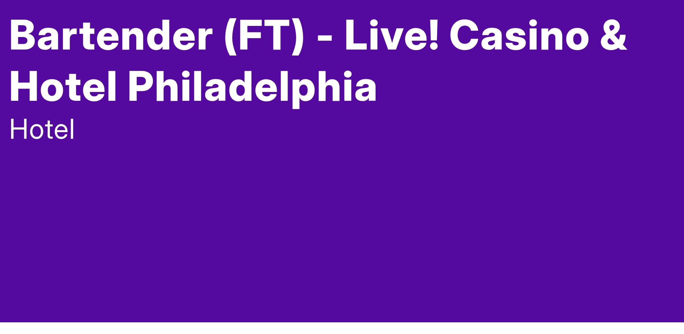 A Live! Bartender is responsible for greeting guests and providing prompt, accurate and courteous beverage service while displaying energetic, fun and outgoing personality. Prepare and provide beverage service to both guests and servers who deliver beverages to guests.