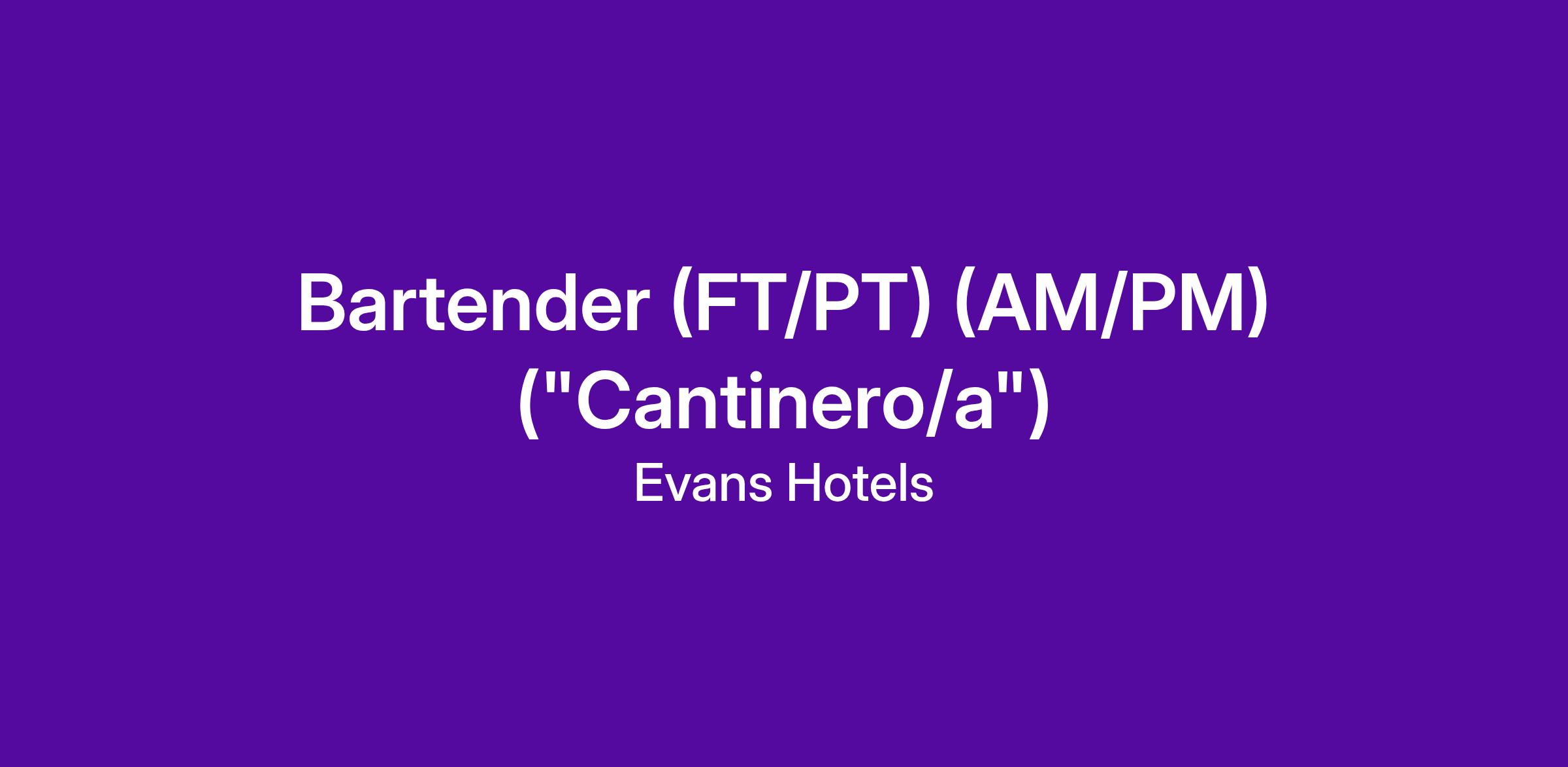 The Bartender ("Cantinero/a") serves each guest with the highest standard of professionalism, courtesy and enthusiasm to make the guest's day/evening enjoyable. Serves beverages to patrons seated at the bar and to cocktail servers servicing the lounge.