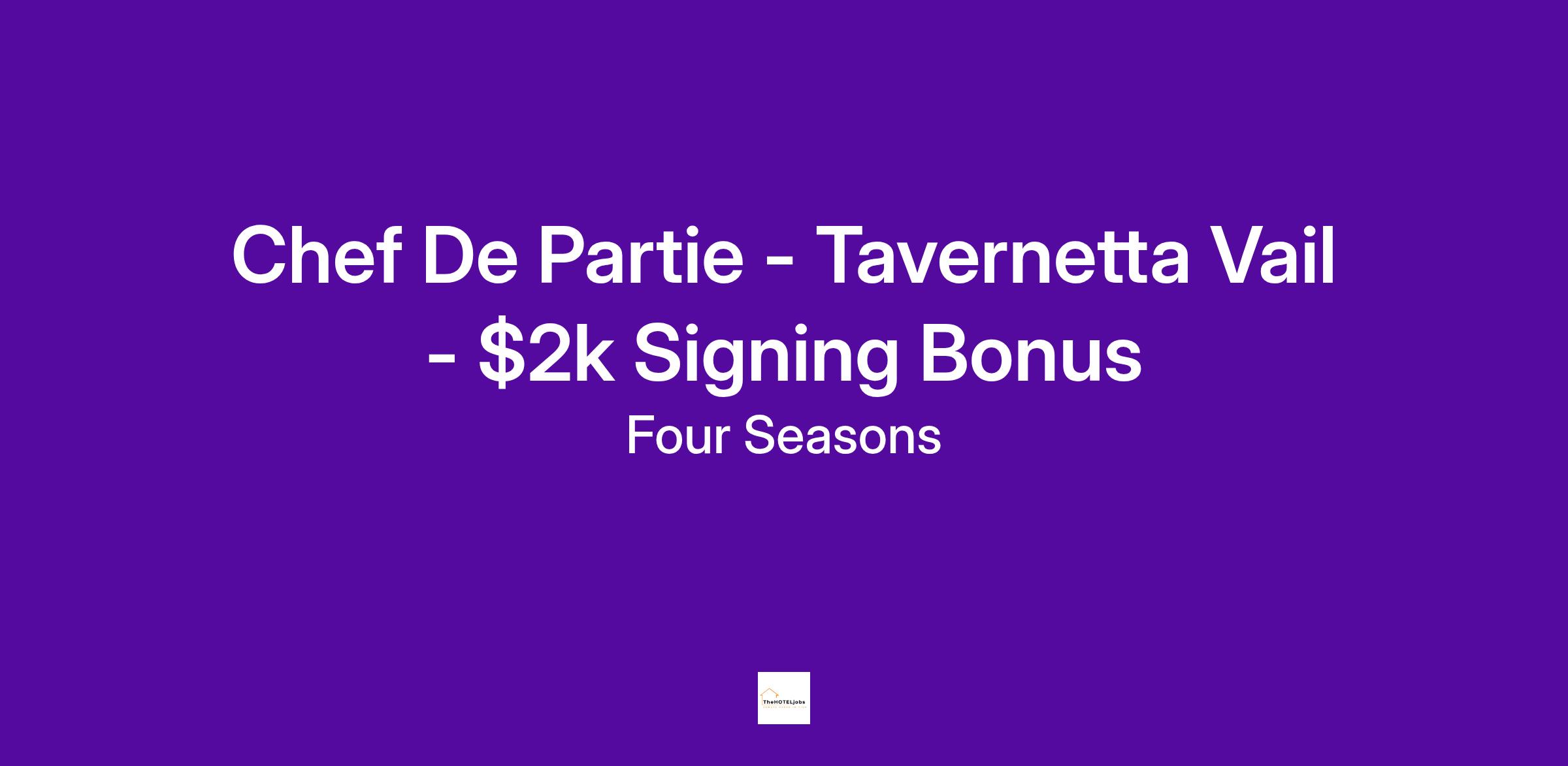 Come and experience the Colorado lifestyle in the heart of the Rockies. Access to world class year-round outdoor lifestyle activities right in your backyard with a quick drive to Denver to stay current with live music, sports and cultural events. Eagle airport is in close proximity with flights to major cities to explore new locations through discounted hotel benefits. Join a team of inclusive, caring, and exceptional colleagues that are happy to invest in your development through best-in-class trainings to reach your potential. A place where you can give back to the community by taking part in our multiple initiatives with local neighborhood organizations that support regional and global causes. Gain exposure through opportunities to task force during low season with a broad network of Four Seasons colleagues to expand your knowledge and resources. We strive to provide a workplace where you can elevate your craft, advance your career, have an active lifestyle, and feel engaged with your team members and the community.Chef De Partie - Tavernetta Vail - $2k Signing Bonus - $500 on first paycheck, $500 after 60 days and $1k after 90 days