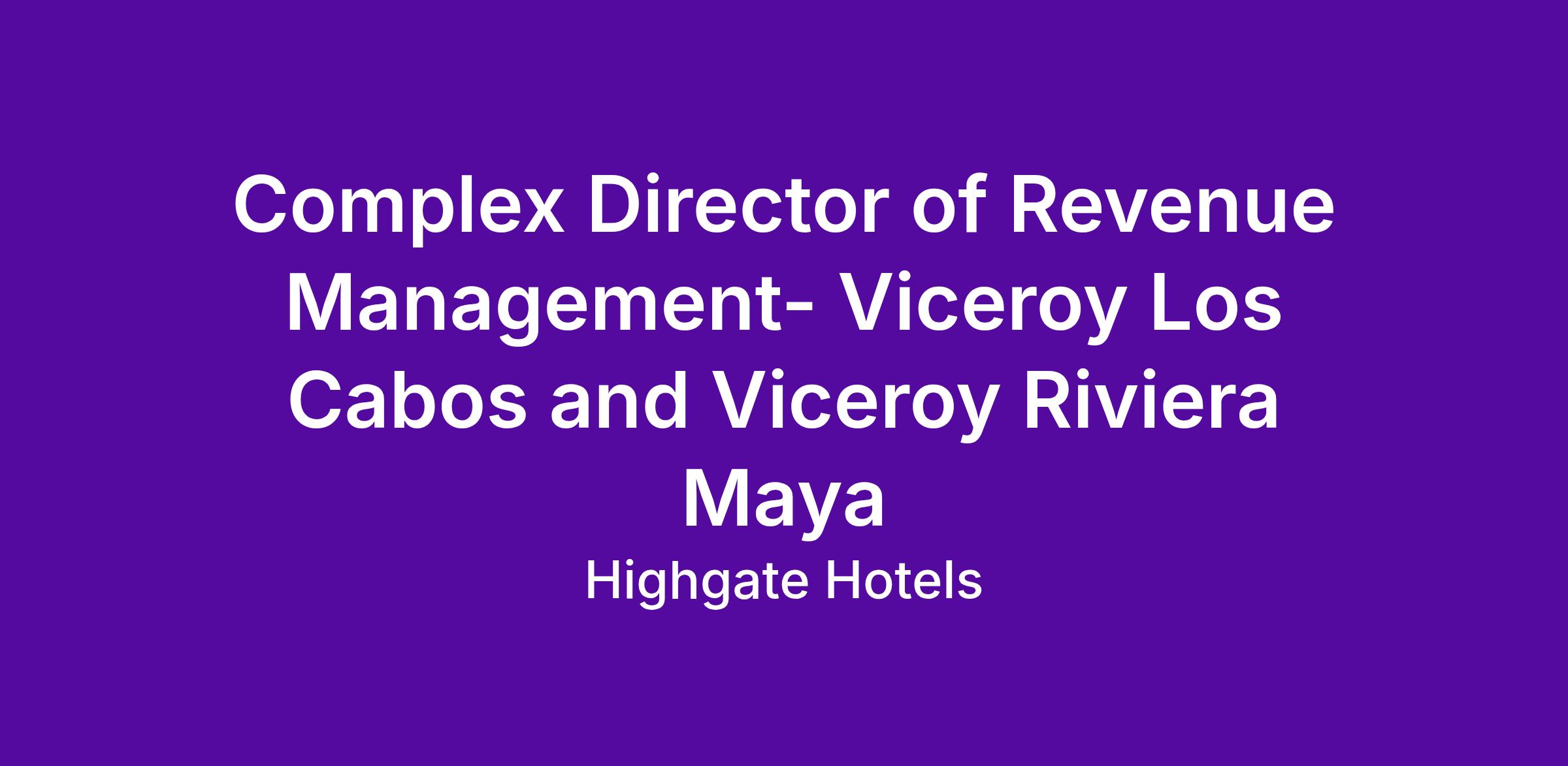 We are seeking an accomplished Complex Director of Revenue Management to oversee Revenue Management for Viceroy Los Cabos and Viceroy Riviera Maya.