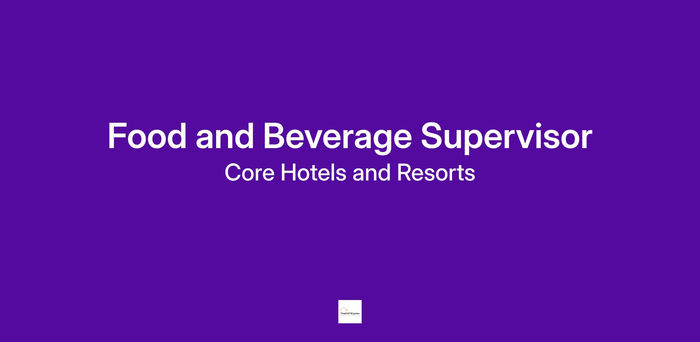 The Food and Beverage Supervisor shall strive to provide exceptional service to both internal and external guests at all times. S/he will be responsible for exemplifying the Hotels Culture and Core Hotels & Resorts Core Values.