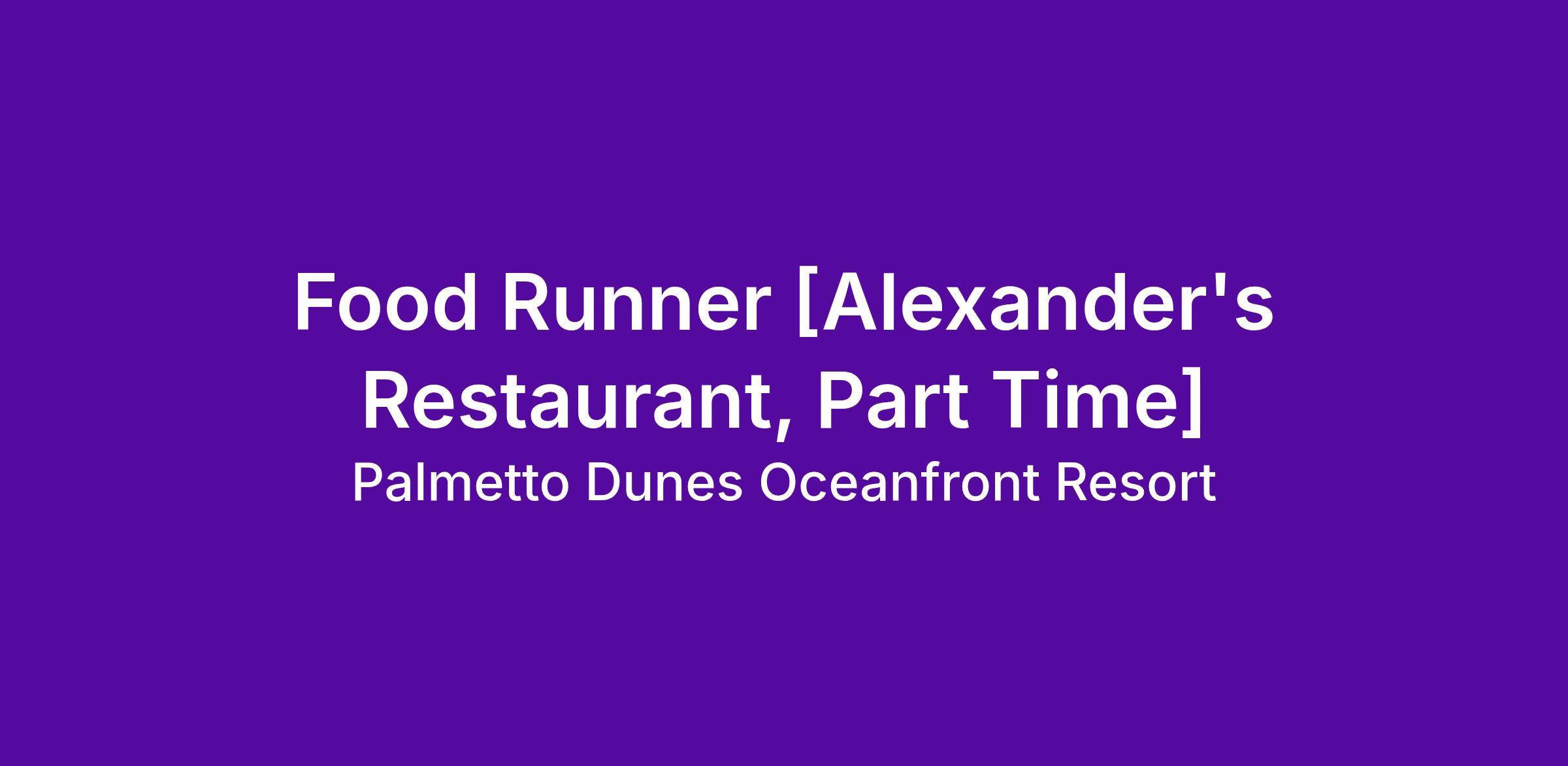 Alexander's Restaurant is seeking a reliable and efficient Food Runner to join our team. As a Food Runner, you will be responsible for ensuring that food is delivered to the correct table in a timely manner. The ideal candidate will have a positive attitude, excellent communication skills, enjoy interacting and conversing with  guests, along with working well within a close team.