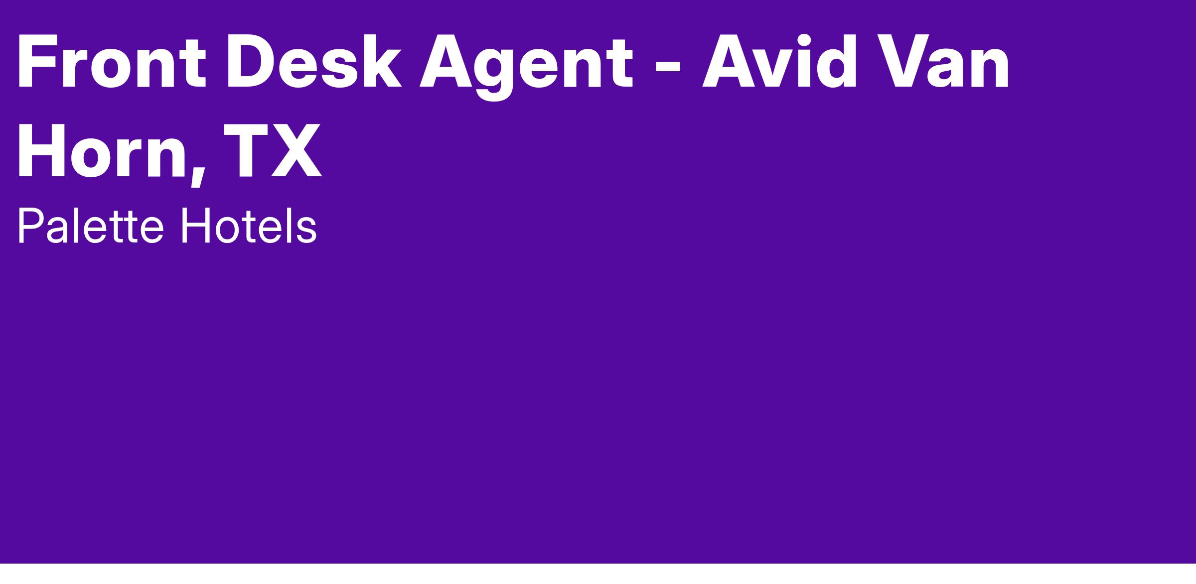 Palette Hotels, is an equal opportunity employer with policies prohibiting unlawful discrimination on the basis of any protected classification under applicable local, state and/or federal laws, which can include race, color, creed, sex, national origin, age, veteran status or physical or mental disability unrelated to job requirements.