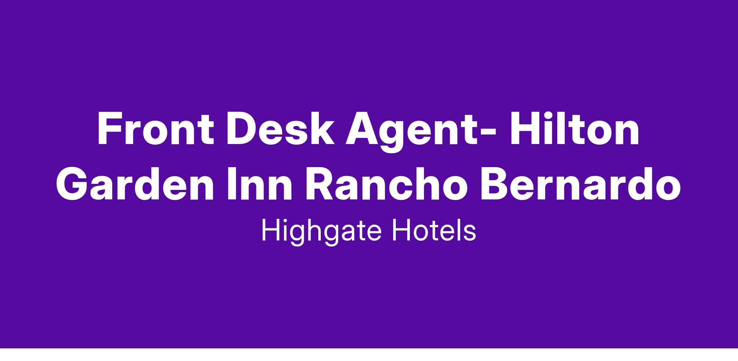 Hilton Garden Inn San Diego/Rancho Bernardo is hiring a Front Desk Agent (full time and part time) for our newly renovated 200 room hotel. Please apply now for immediate consideration.