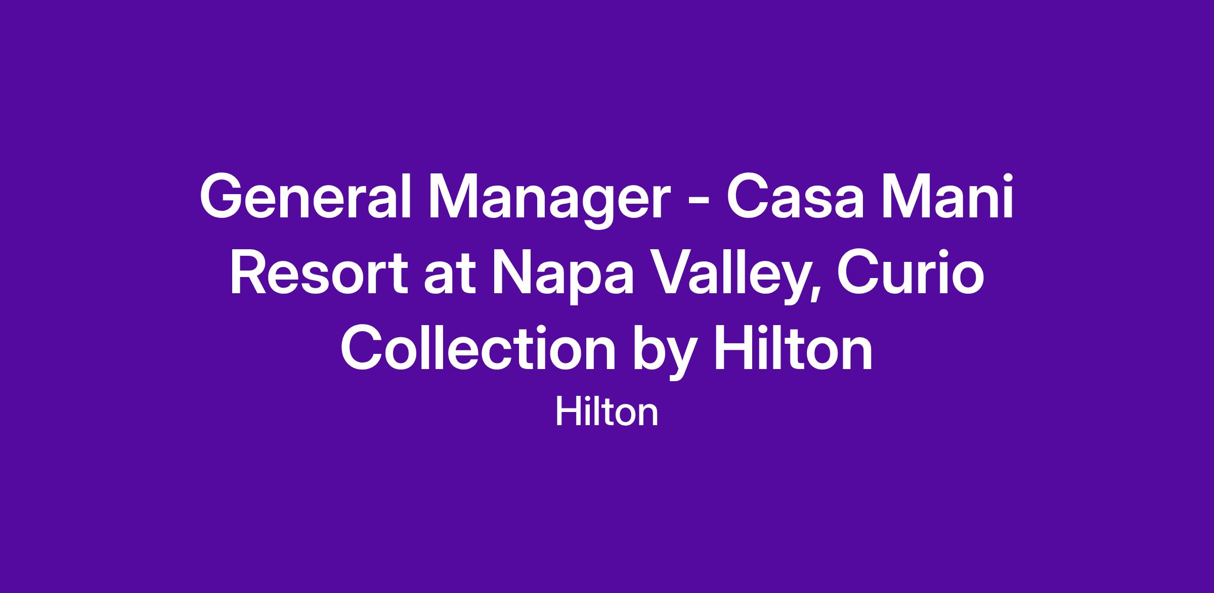 The General Manager of Casa Mani Napa Valley will lead a distinctive, lifestyle-driven resort rooted in the spirit of wine country. This role is responsible for shaping the guest experience, building a high-performing team, and bringing the property’s vision to life through thoughtful leadership, operational excellence, and strong partnership with ownership to ensure long-term success.