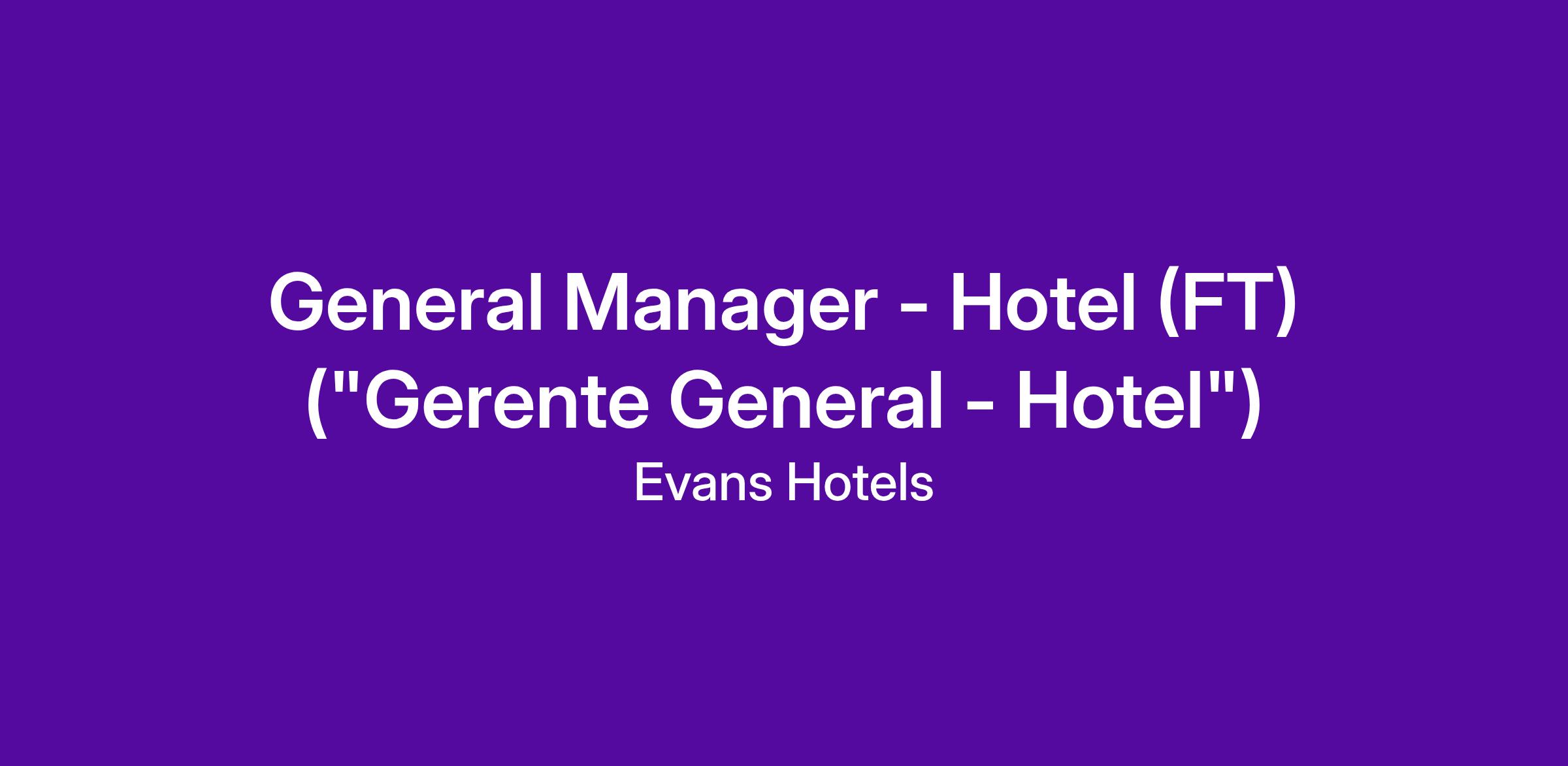The General Manager - Hotel ("Gerente General - Hotel") is responsible for the overall leadership and successful operation of the Bahia Resort Hotel, ensuring exceptional results for guests, owners, and associates. This role leads and supports a multi-department hospitality team to deliver a consistently outstanding resort experience, uphold brand and service standards, and achieve financial and strategic goals. The GM directly oversees Rooms, Housekeeping, Laundry, Security, Engineering, Groundskeeping, Food & Beverage (including Catering and Conference Services), and the on-property Human Resources function (with HR also maintaining a shared reporting relationship to Corporate Human Resources). The GM partners closely with shared support divisions, including Finance, Sales, Marketing, and Revenue Management, and is accountable for revenue growth, expense control, asset stewardship, talent development, and cultivating a positive, high-performance culture aligned with Evans Hotels’ values and service philosophy.