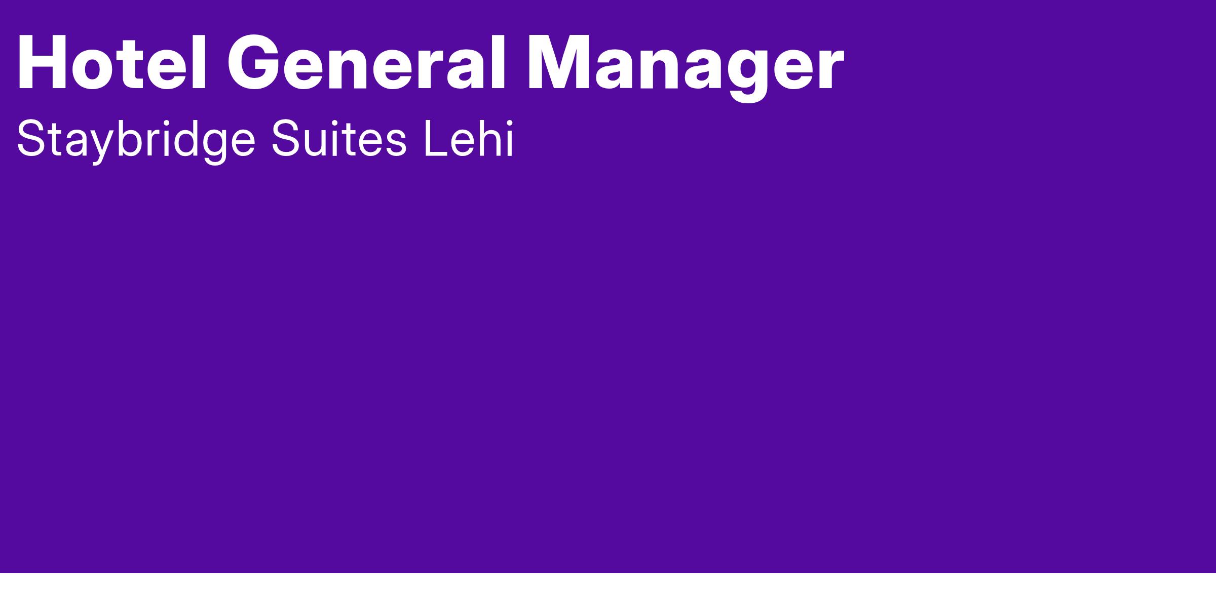 Staybridge Suites Lehi is actively seeking an exceptional full-time Hotel General Manager to become a vital part of our management team.