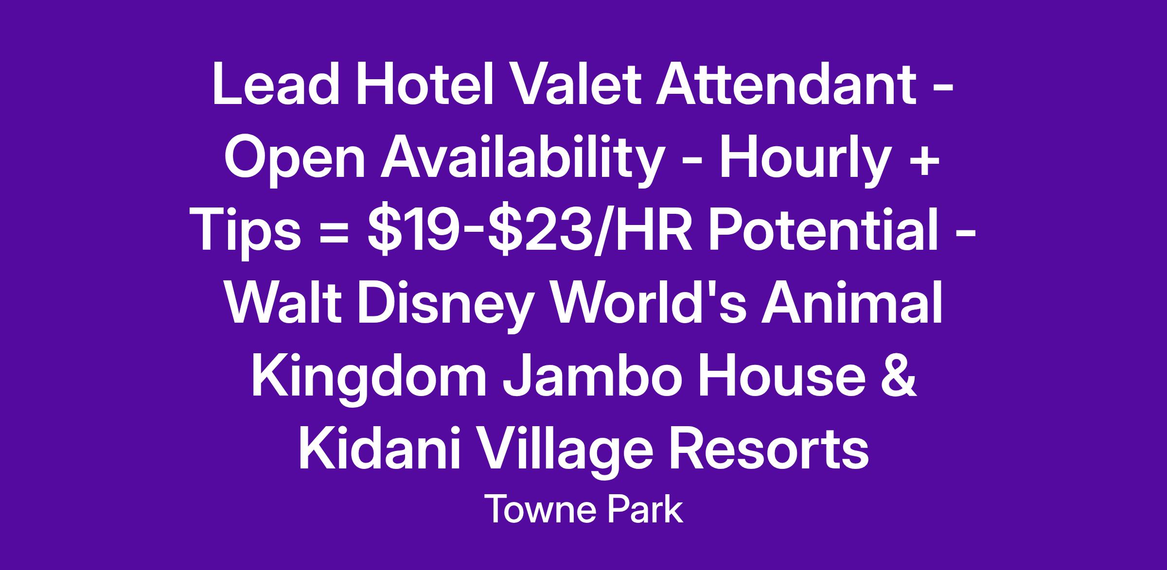 Compensation: Towne Park is committed to offering competitive, fair, and commensurate compensation. Actual compensation will be based on a candidate’s job-related skills, experience, education or training, and location. The hourly base pay range for this position is $11 per hour plus $8-$12 per hour in tips.