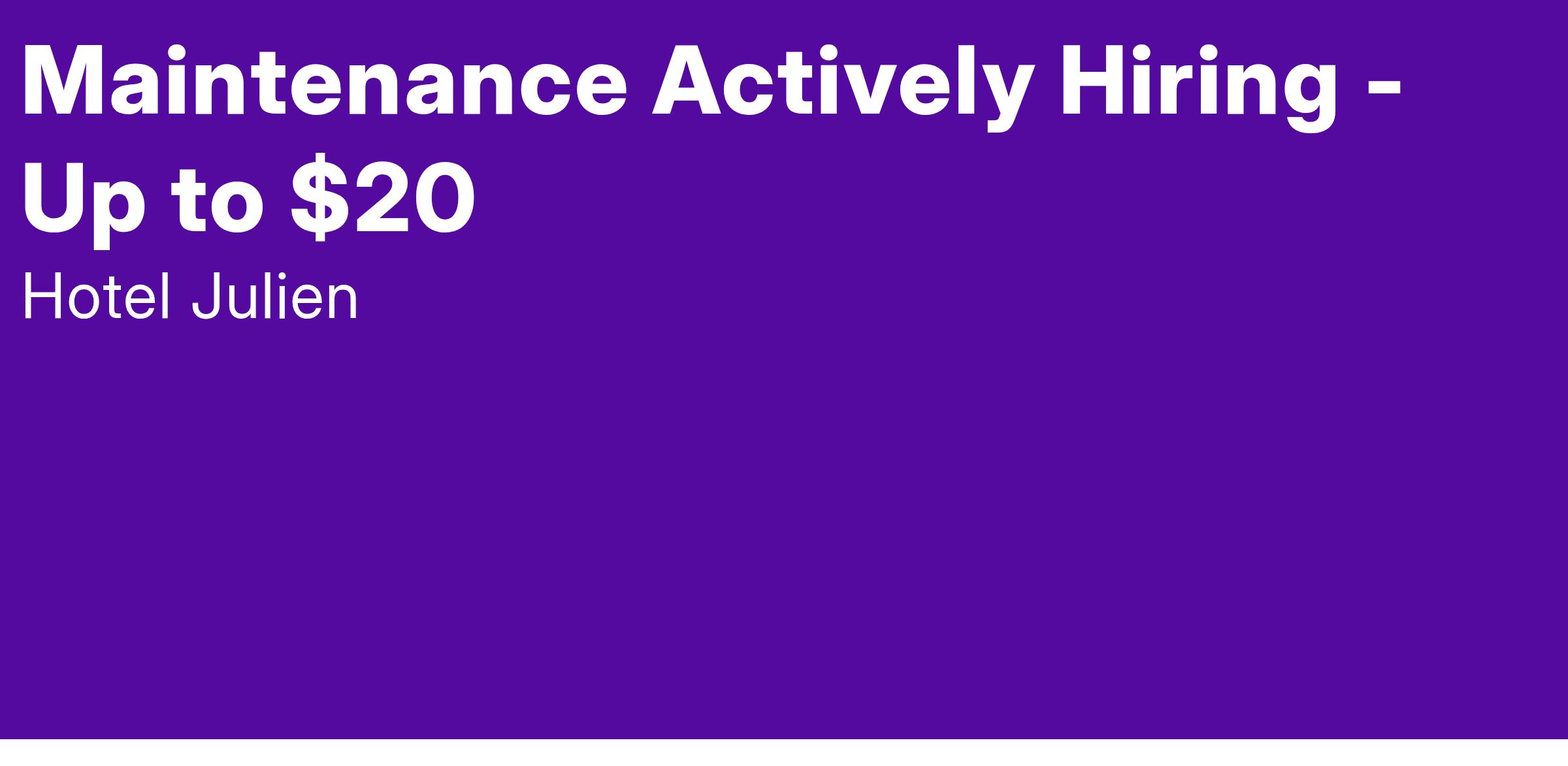 You will be offered great benefits such as Medical. Become an integral part of our community-focused hotel family-apply now to help keep HOTEL JULIEN in top shape!
