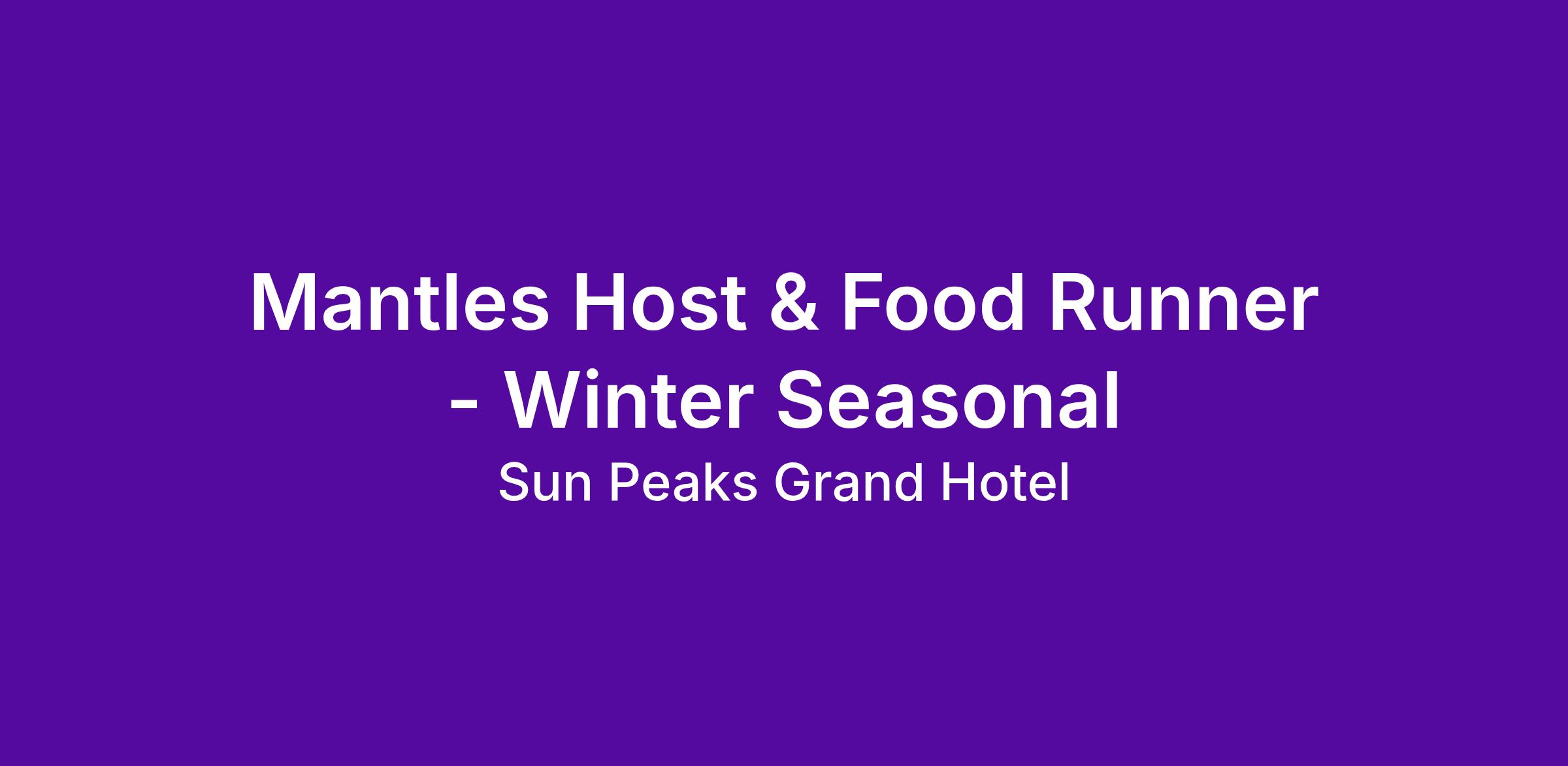 Mantles Restaurant and Lounge are looking to hire Hosts & Food Runners for the upcoming winter season. The Host & Food Runners are available for all meal periods and work closely with the serving and bartending team to ensure exceptional guest service. They handle various tasks such as greeting guests, delivering food, clearing tables, and taking take-out or in-room dining orders. During breakfast, they also assist as servers for our buffet. The ideal candidate for this role is a skilled communicator and multitasker passionate about providing excellent service. They prioritize Health & Safety and thrive in the mountain environment. As part of our team at Sun Peaks Grand, successful candidates can expect a workplace culture to be proud of and perks such as free access to golfing, biking, hiking, skiing and snowboarding. If you are interested in starting a career in hospitality or wish to enhance your skills, please fill out an application to work, live, and play where you belong.