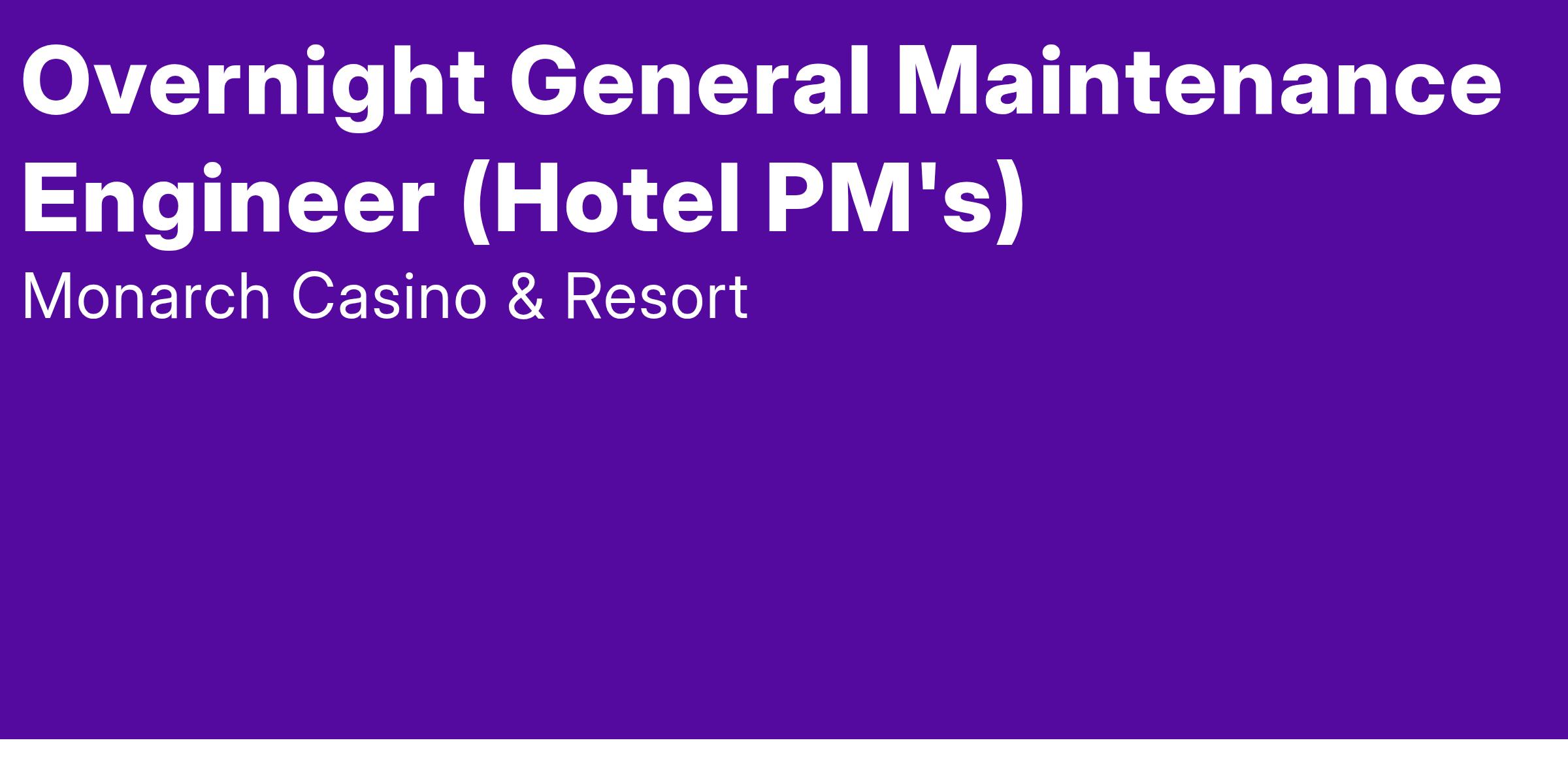 Monarch Casino Resort in Black Hawk is a 23 story resort with over 500 rooms, 4 restaurants, and the one of the country's top spa. The Monarch Casino Resort Spa is looking for a passionate General Maintenance Engineer to join our team! You will thrive in a fast-paced, high-volume environment that exceeds the expectations of our guests and Team Members.