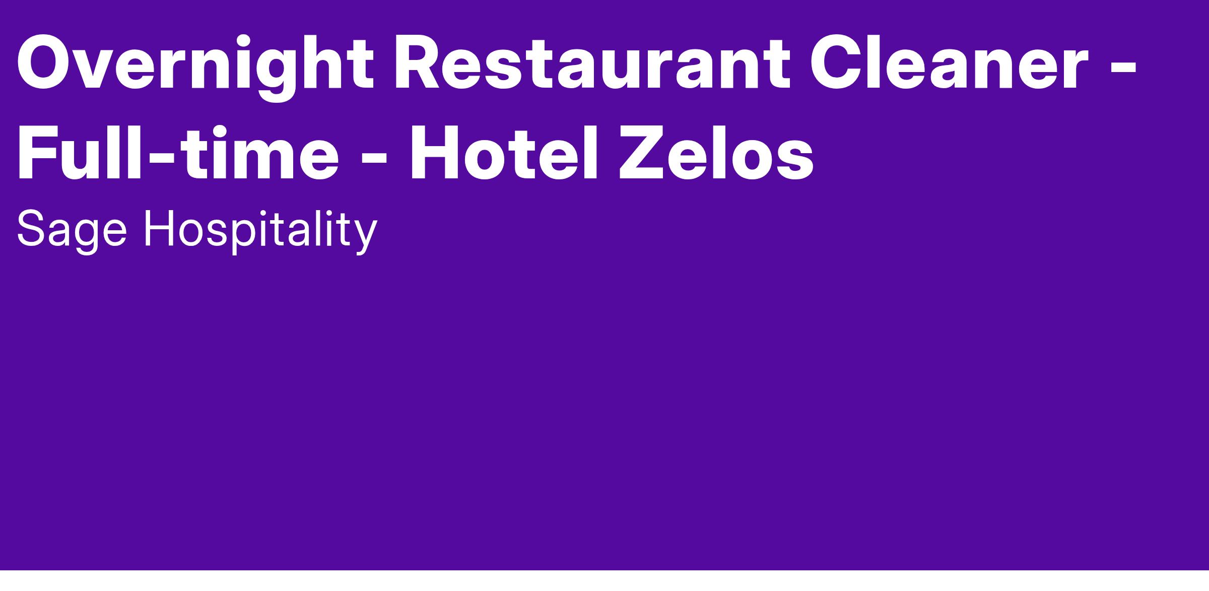 Dirty Habit en el Hotel Zelos busca un/a limpiador/a de restaurante nocturno/a a tiempo completo para unirse a nuestro equipo.¡ERES UNO!Como parte de Sage Hospitality Group, nos esforzamos con pasión por ser los mejores y crear excelencia en todo lo que hacemos. Creemos en enriquecer vidas, una experiencia a la vez. Más que un eslogan, empoderamos a nuestros empleados para que generen un impacto positivo en las comunidades donde vivimos y trabajamos. Al brindar un servicio genuino, construimos relaciones con nuestros huéspedes y valor para nuestros accionistas, creando experiencias inolvidables.Buscamos personas con ideas independientes. Personas que aprovechen su espíritu emprendedor para romper con las ideas preconcebidas. No tememos forjar nuestro propio camino. Después de todo, es lo que hacen los líderes de la industria. Por eso, damos la bienvenida tanto a personas que asumen riesgos como a personas con espíritu creativo. Sea cual sea tu rol diario, Sage reconoce que tu éxito va más allá del trabajo que realizas; se trata de quién eres, por eso invertimos en tu crecimiento personal y profesional. ¡Esperamos que consideres unirte a nosotros!
