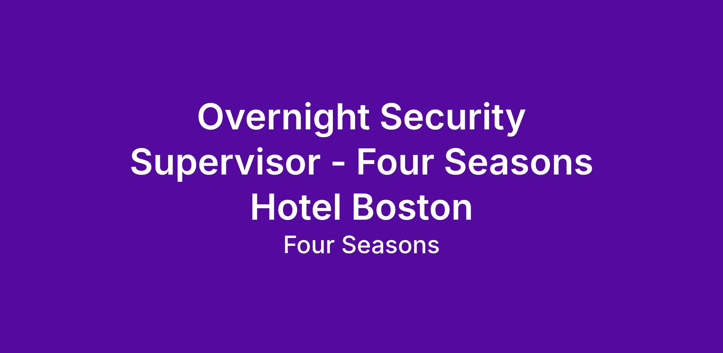 Four Seasons Boston is seeking an Overnight Security Supervisor who shares our passion for excellence and is enthusiastic about creating the ultimate service experience. The Overnight Security Supervisor will be a member of a small dynamic team delivering great service to our internal and external guests. We are looking for someone with excitement and dedication in promoting Security and Safety objectives outlined by the Director of Security and the Four Seasons Hotel Boston.