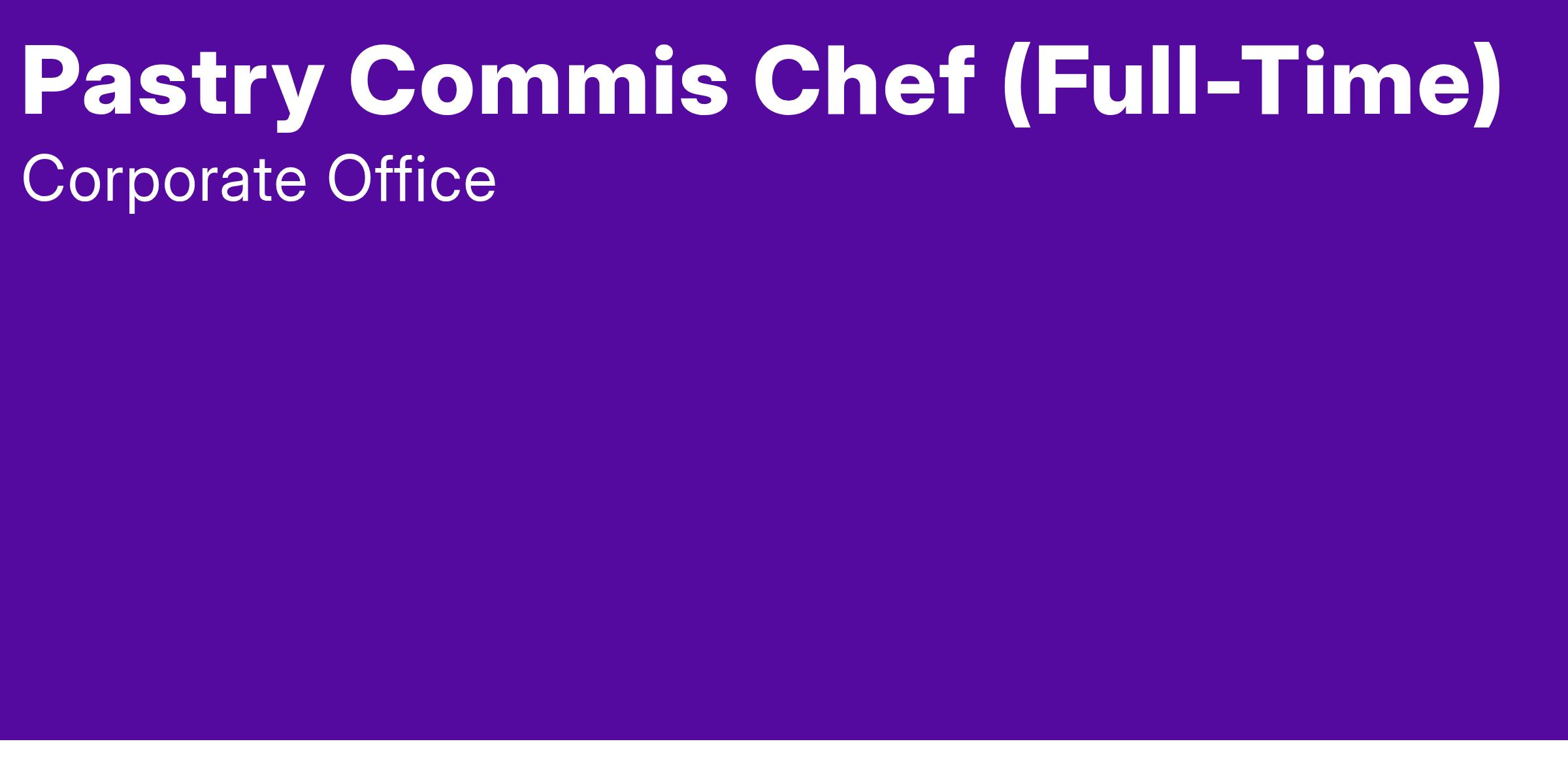 The Pastry Commis will be responsible for the preparation of all cakes, pies, muffins, brioche and pastries of all types in accordance with the standards of quality set by the Pastry Chef.