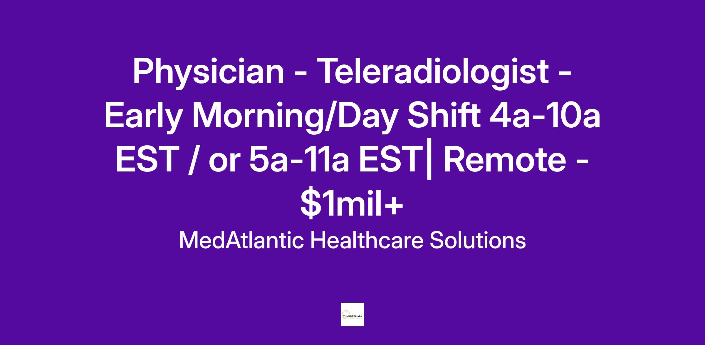 MedAtlantic is seeking US-based Radiologists to join a radiologist-owned & physician-focused teleradiology practice for a 100% remote teleradiology position.