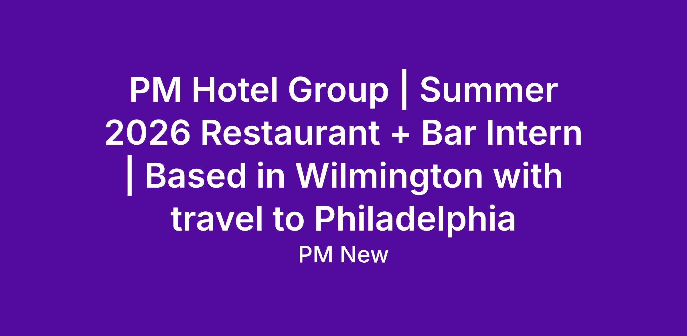 The Summer 2026 Restaurant + Bar Intern will gain handsâon experience across frontâofâhouse (FOH) service, bar operations, culinary coordination, finance/P&L fundamentals, guest experience, and brand standards. Based in Wilmington with scheduled travel to Philadelphia, you’ll support several dynamic urban properties, learning how to run a highâperforming R+B program from prep to profit.