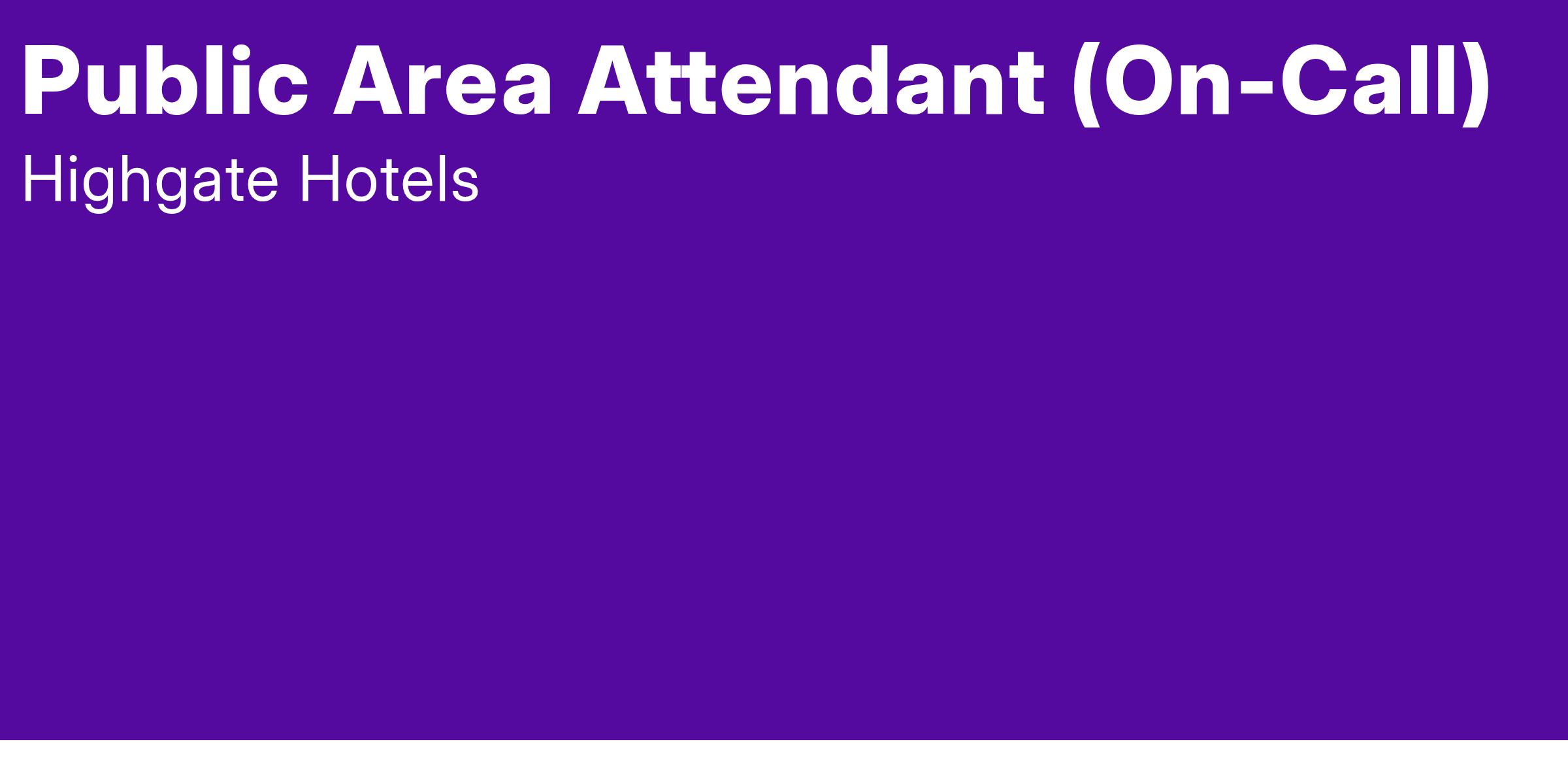 The Public Area Attendant (On-Call) is responsible for maintaining Highgate Hotel Standards in all assigned lobby areas, Business Center, Fitness Center, restaurants, public restrooms, corridors, meeting rooms, offices, elevators, pool areas, parking garages, driveways, and any other public spaces. May also be required to complete special cleaning assignments and perform Room Attendant and House Attendant duties as necessary.
