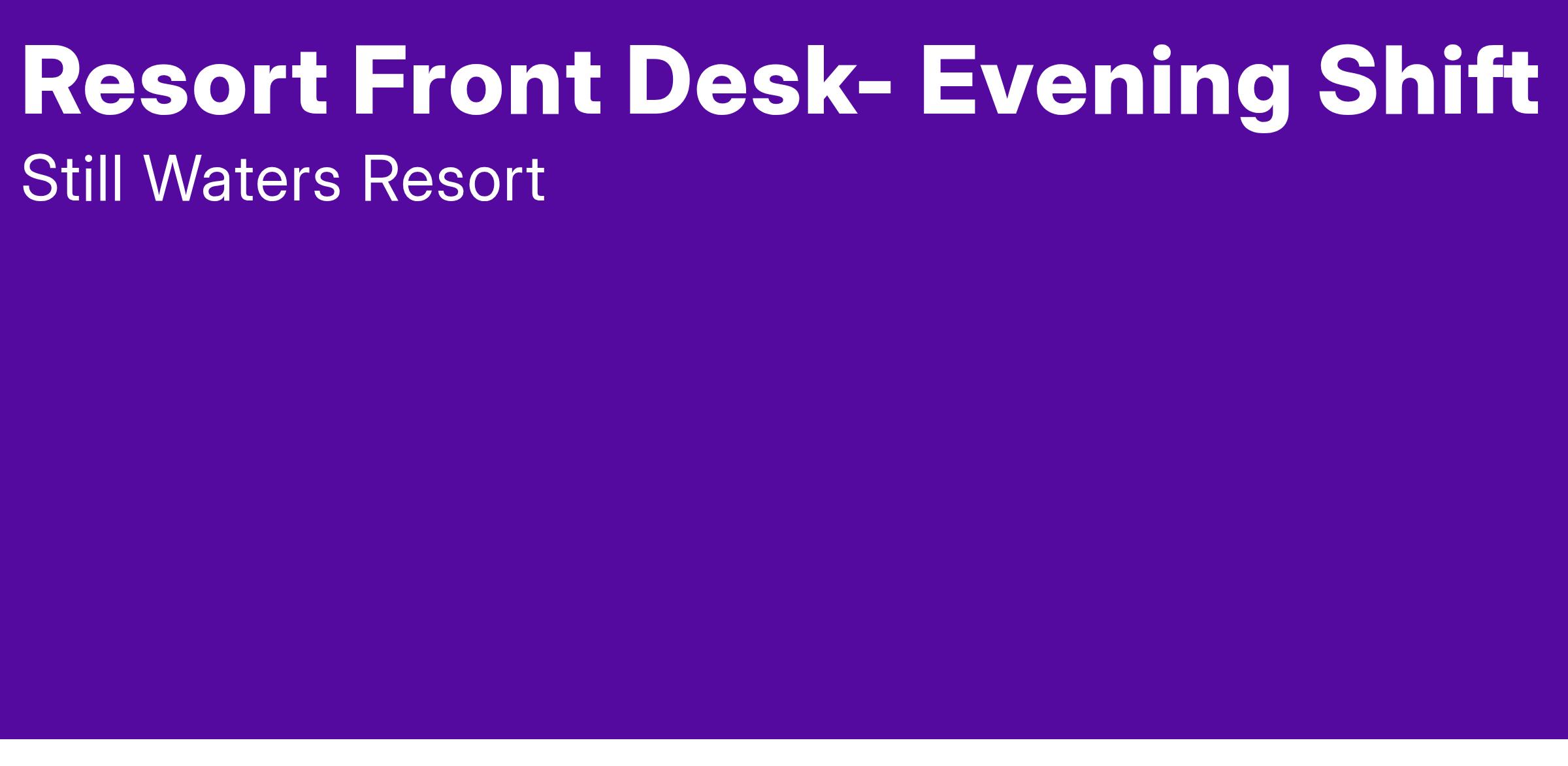 Do you have a passion for creating memorable guest experiences? Are you a warm and welcoming individual with a knack for hospitality? Still Waters Lakefront Resort, a beloved family-owned haven for 45 years, is seeking an enthusiastic Evening Guest Services Representative to join our family! Be the first and last impression for our guests, creating magical moments from check-in to check-out.