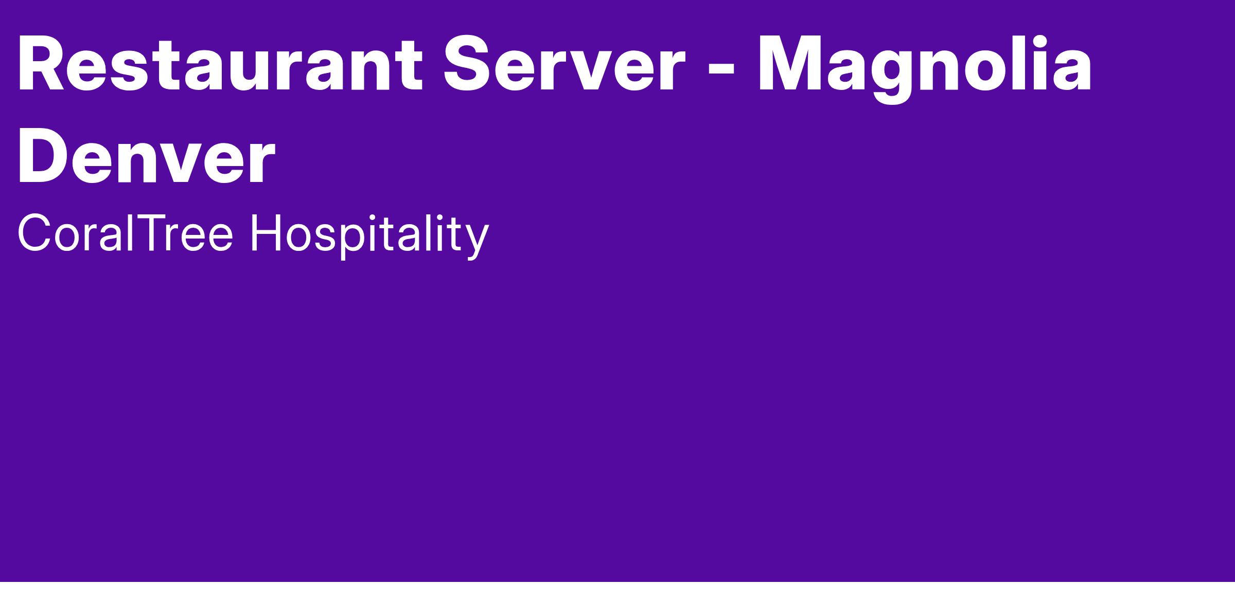 The Magnolia Hotel Denver, a Tribute Portfolio Hotel, is located in the heart of Denver’s vibrant downtown. Visit us at www.magnoliahotels.com/denver. The Magnolia Hotel’s primary food outlet is Harry’s, one of downtown Denver’s long-time favorite place to eat and drink. The hotel also hosts a variety of groups, providing us the opportunity to serve up some beautifully crafted banquet menus. We are currently seeking a Server to work the morning service period for our outlet Harry’s.