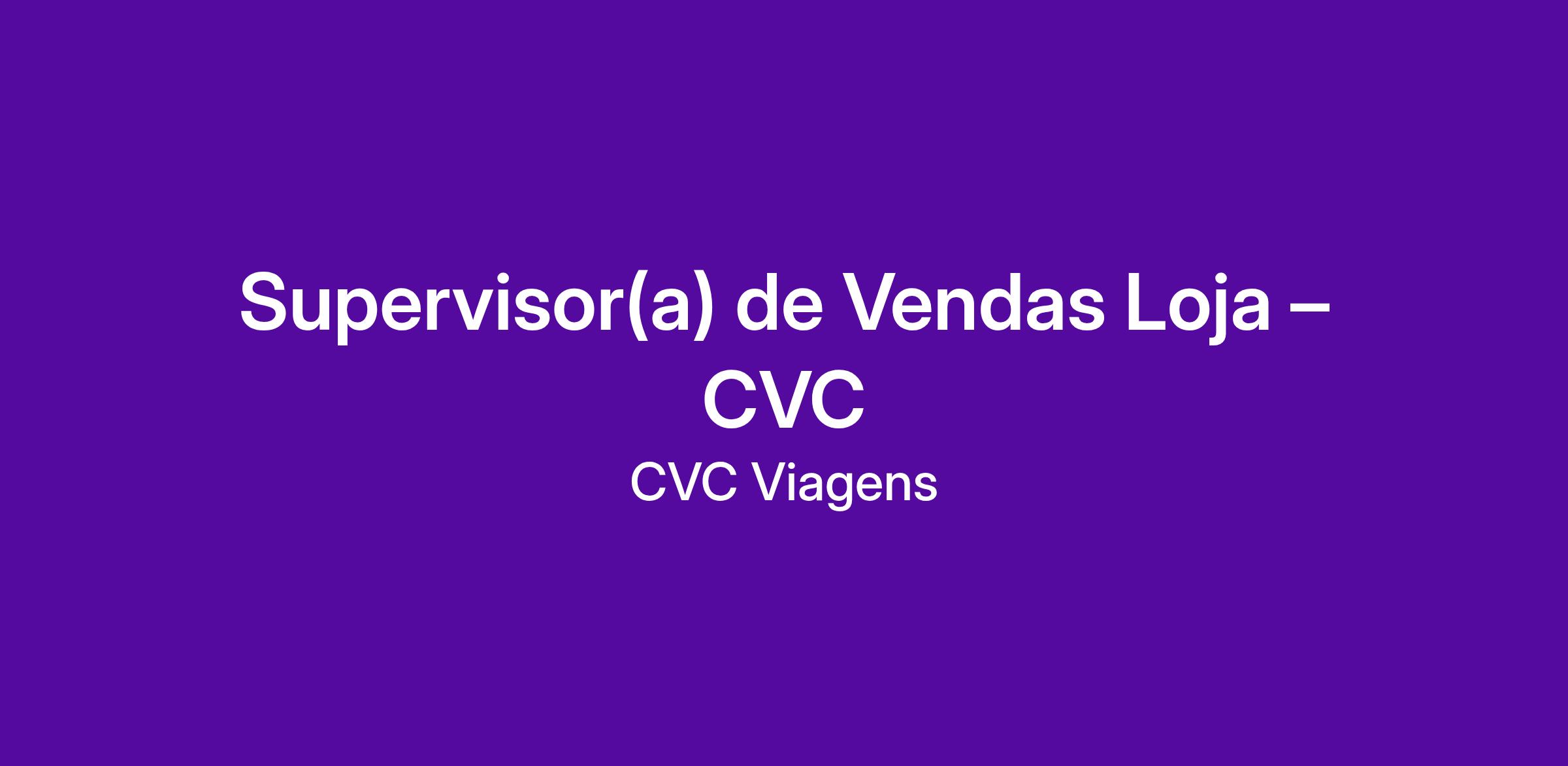 Estamos contratando Supervisor(a) de Vendas com experiência no mercado CVC, vendas de pacotes nacionais e internacionais, cruzeiros, aéreos, hotéis e locação de veículos, que esteja em busca de crescimento profissional e desenvolvimento na carreira.