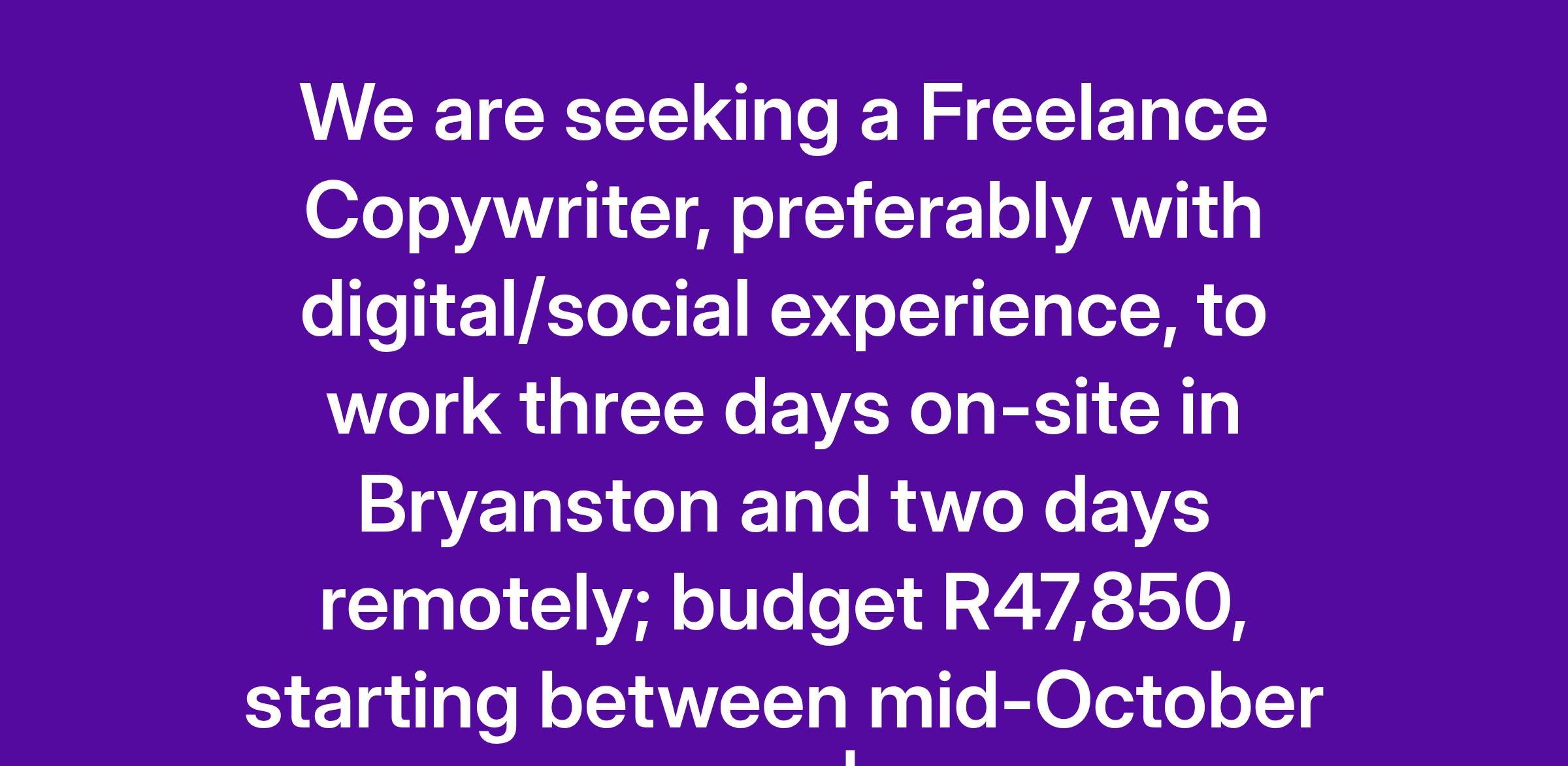 We’re looking for a talented Freelance Copywriter with a strong background in digital and social content. You’ll work closely with our creative and account teams to craft compelling, on-brand copy that engages audiences and drives results.
