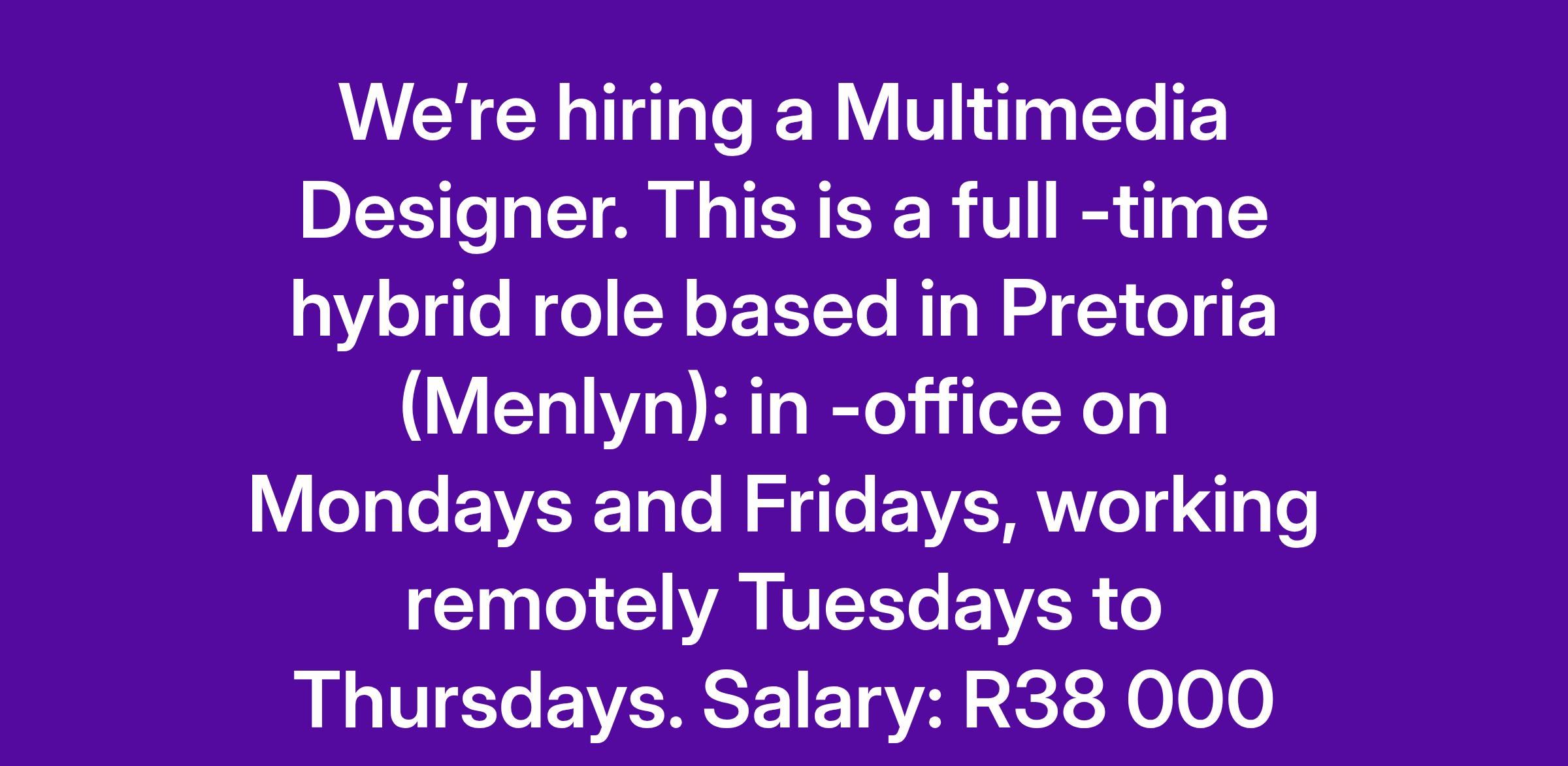 We build brands that move people — especially in fintech and financial services, where trust and clarity are everything.<\/span><\/b> We’re a strategic brand and communications agency that partners with challenger fin -techs, banks, insurers, and complex enterprises that need clear thinking, powerful brands, and strategies that perform. We’re looking for a Multimedia<\/b> <\/span>Designer<\/span><\/b><\/span> who can take a brand from start to finish — from concept and identity creation through to full rollout across digital and print applications. This role goes beyond producing great visuals; it’s about building cohesive brand systems that stand up in the boardroom, on screens, and in the real world. As a <\/span>Designer<\/span><\/b><\/span>, you’ll craft scalable brand identities, ensure consistency across every touchpoint, and push creative boundaries in one of the most dynamic industries out there: fintech. Hint:<\/span><\/b><\/span> Sound like you? Then you’ll want to read this all the way to the bottom… Lead the creation of brand identities and visual systems, from concept through to fully developed guidelines. Apply brands seamlessly across digital platforms (websites, social, campaigns) and print applications (collateral, packaging, environments). Collaborate with strategists, writers, and account managers to translate strategic thinking into impactful design. Deliver high -quality design assets for campaigns, presentations, sales collateral, and activations. Present and justify creative solutions confidently to both clients and internal teams. Maintain and enforce brand consistency across all outputs and touchpoints. Mentor and support junior designers, helping to raise the level of craft within the studio. Stay on top of design, fintech, and digital branding trends to keep our work sharp and globally competitive.<\/span> Proven experience as a Multimedia <\/span><\/b>Designer<\/span><\/b><\/span> or <\/span><\/b>Brand Designer<\/span><\/b><\/span> in an agency or in -house brand team.<\/span><\/b> A portfolio showcasing complete brand journeys — from identity creation to systematisation and rollout across digital and print. Strong grasp of brand systems, typography, colour theory, and design principles. Experience in fintech, financial services, or other complex B2B categories is a strong advantage. Proficiency in <\/span>Adobe Creative Suite<\/span><\/b><\/span> and <\/span>Figma<\/span><\/b><\/span>; motion or 3D experience is a plus. Ability to manage multiple projects while maintaining exceptional attention to detail and consistency. Excellent communication and presentation skills — able to explain the clearly “why” behind your design choices. A collaborative spirit with the confidence to lead projects and drive creative thinking. Relevant tertiary qualification in Design, Visual Communication, or a related field. We’re a specialist fintech and financial services brand agency — ambitious and scaling internationally. You’ll have a voice. You’re not just here to push pixels; you’ll help shape the future of how financial brands look, sound, and scale. Flexible hours and a hybrid model — core hours are 09:00–14:30, remote -first with an optional Cape Town office. We value outcomes over timesheets. You’ll design for high -performance fintechs, banks, insurers, and payments players who expect world -class creative. You’ll join a tight -knit team of strategists, creatives, and operators who back each other, solve hard problems, and celebrate wins. We’re still small and fast -growing — you’ll feel the pressure and see the gaps. It takes enthusiasm, resilience, and a passion for your craft. We move quickly. Priorities and projects can shift overnight, so adaptability is key. Everyone here is mission -driven. We care deeply about building trust for our clients and doing work that matters. The bar is high. Our clients compete on global stages, so your thinking, execution, and presentation need to match that standard.<\/span>